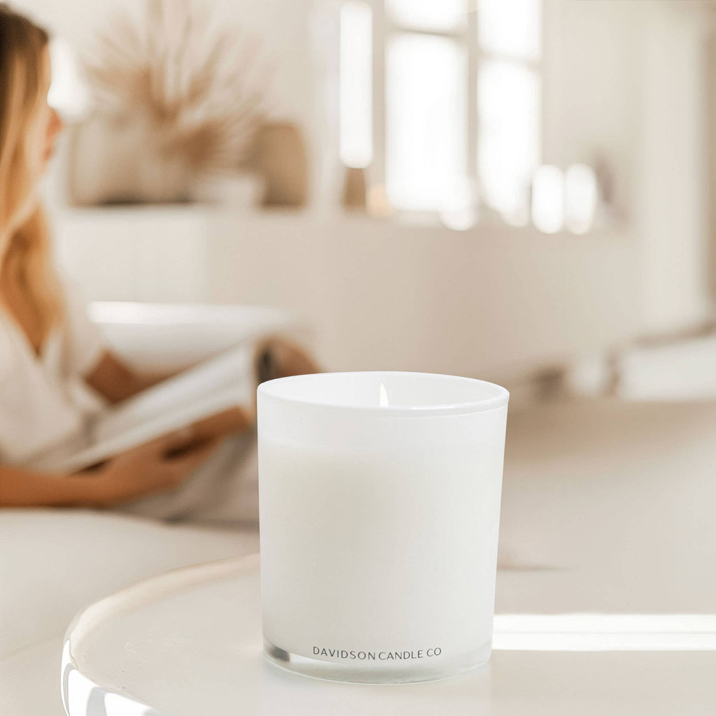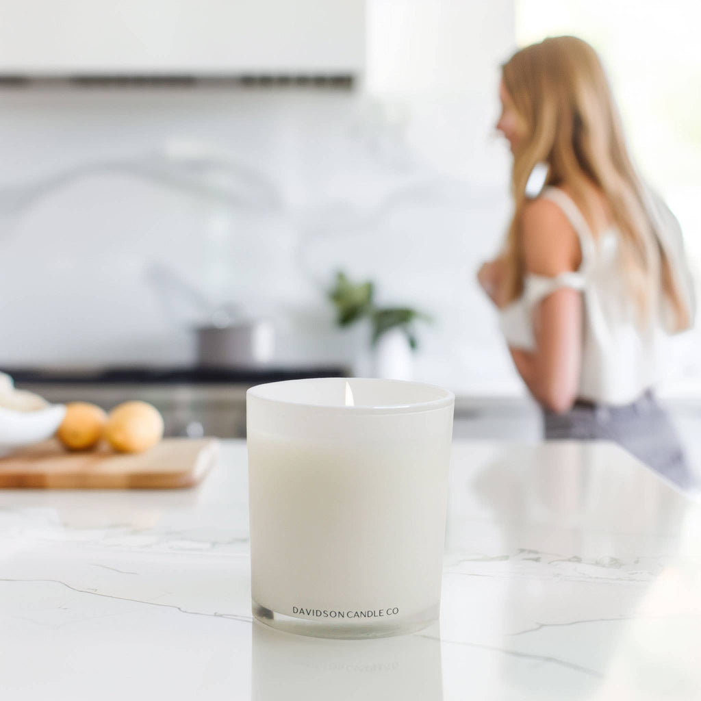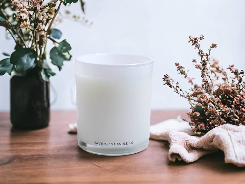 This heavy glass container is substantial in weight, white in color with a glossy finish. We use a blend of Apricot and Coconut waxes with a wood wick.  Each candle is made using fragrances that are phthalate free and infused with essential oils. All candles are hand poured in Davidson, North Carolina USA. Acknowledging the significance of presentation, we offer thoughtfully crafted and printed product boxes, elevating the overall shopping experience.