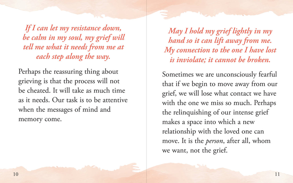 Here is a compact, condensed version of  Healing After Loss: Daily Meditations for Working Through Grief , the bereavement classic that has helped thousands cope with grief for more than 30 years.   Brimming with insightful daily meditations, quotations, and affirming truths, this small book may serve as a steadfast companion for anyone navigating the path of healing.  Measuring just 3-1/4'' wide x 4'' high, this compact volume is perfect for keeping in a pocket, purse, or desk drawer, ensuring that wisdom, understanding, and acknowledgement are always within reach.  Pocket-sized tome has a durable hardcover binding and comes with a protective dust jacket.  It also features a ribbon bookmark with which to keep your place.  The bookmark comes with a 24K gold-plated charm, adding a touch of grace to reflective moments.  80 pages of support and encouragement.  A thoughtful gift for anyone in need.