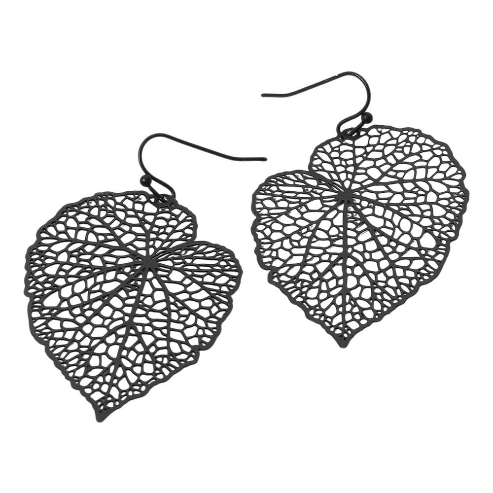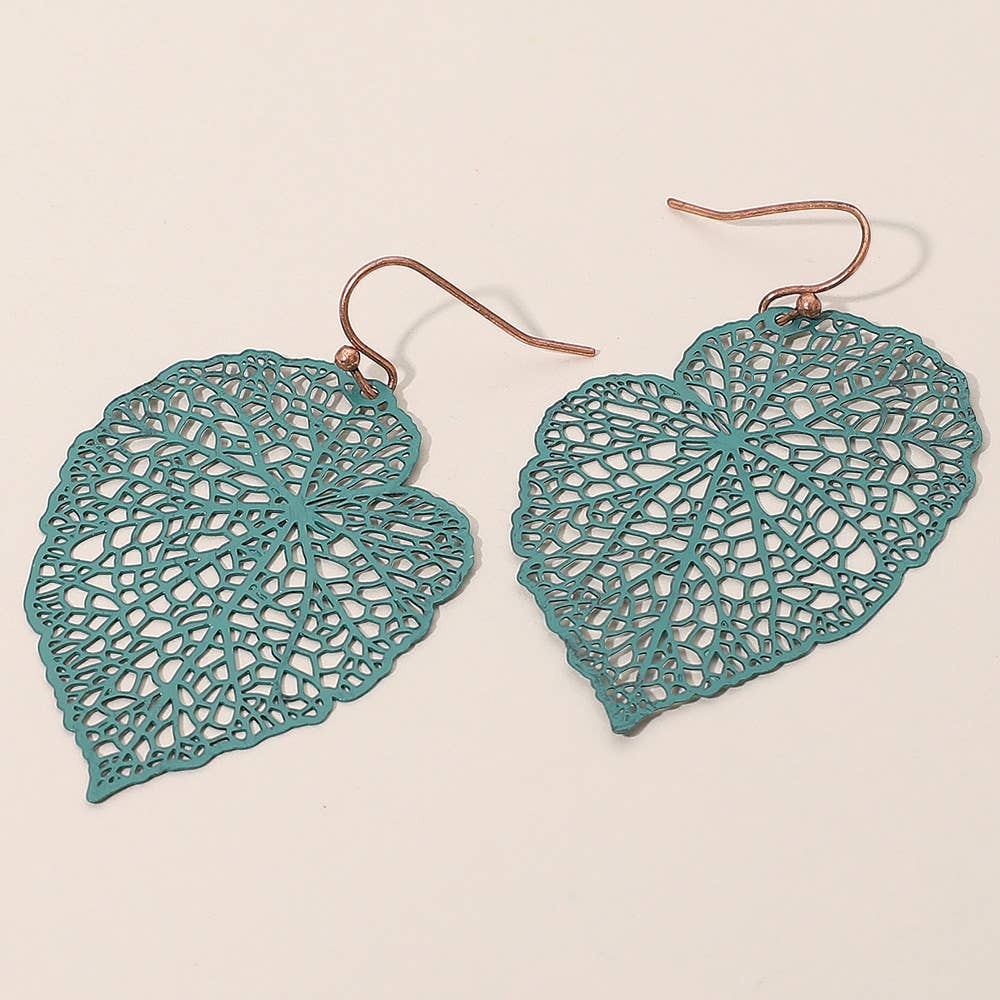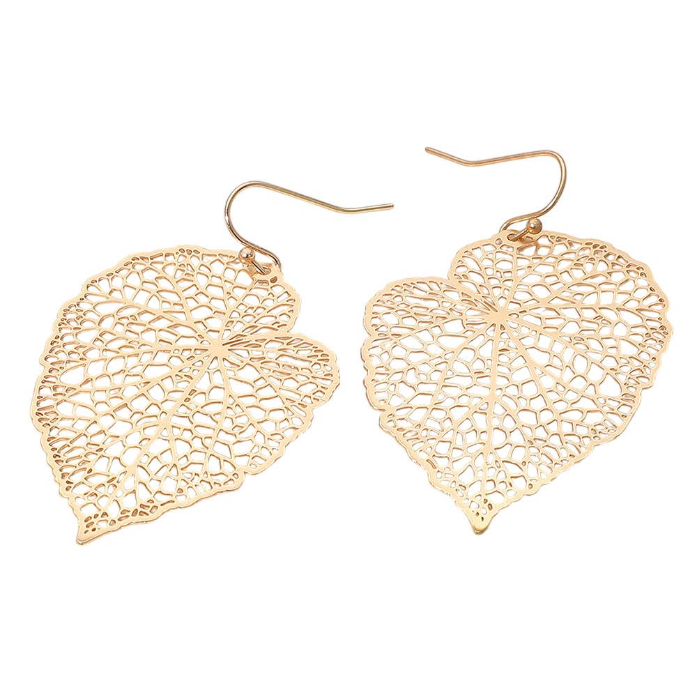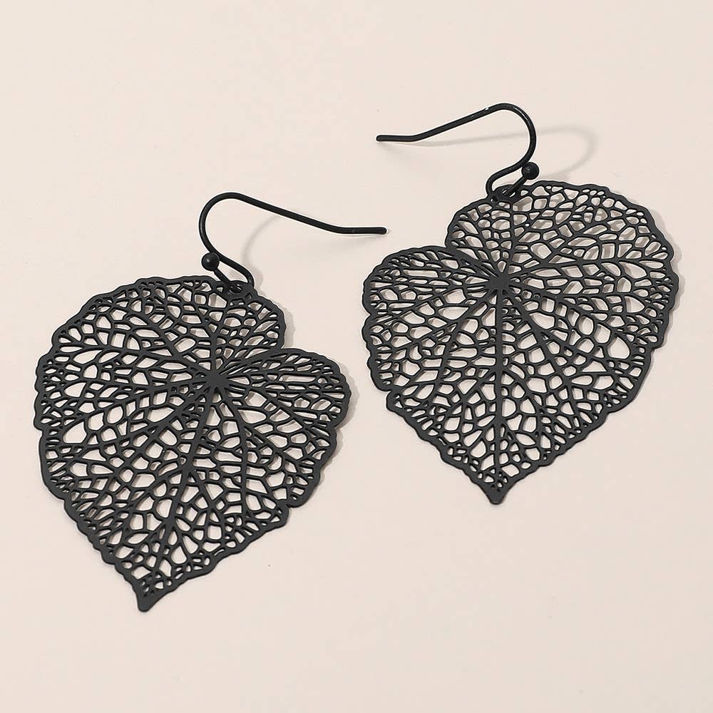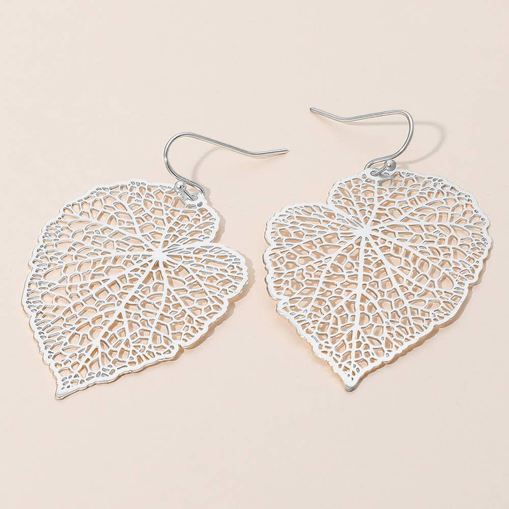 Elevate your style with these lightweight filigree leaf drop earrings. Featuring an intricate cutout design, they add a touch of elegance and nature-inspired charm to everyday and special outfits.